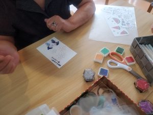 ハガキを作る過程で手や指を使うので、手指の緻密性を向上させるリハビリになります😃