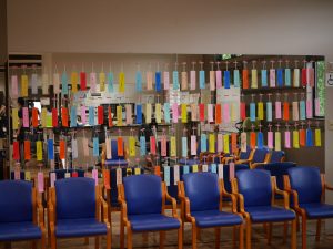 始めは「えー願い事なんか、ないわあ」と仰り、悩まれる方も多かったですが、次第に筆が進み「足の痛みがよくなりますように」「〇〇へ行けますように」という願いや、ご自身だけでなく、ご家族様の幸せを願われたり、「大金が欲しい」「背が5㎝伸びますように」など、くすりっと笑える願い事まで…!