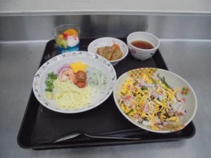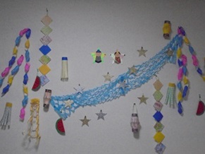 ガーデン大安寺の七夕 2024.07.29 ガーデン大安寺 7月のレクリエーションは七夕の笹飾り作りと短冊作りを実施しました。それぞれ自由に短冊を書き、笹に飾り付けて願い事を託していました。 また、お昼に天の川をイメージした五色素麺と、五目ちらし寿司を一緒に召し上がって頂きました。 デザートのフルーツたっぷりブルーハワイゼリーもとても好評でした。 楽しくて、涼しく美味しい七夕を過ごして頂けました。