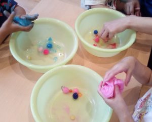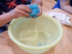 スライムに好きな色の絵の具を足して、色が混ざっていく様子も楽しみましたよ🎨✨